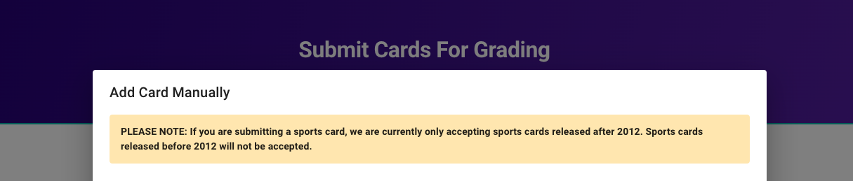 Disclaimer: We've added a disclaimer to the Customer Manual Card Popup, letting customers know that we only accept sports cards released after 2012. This helps ensure that we're grading cards accurately and fairly, and that customers know what to expect when submitting their cards for grading.