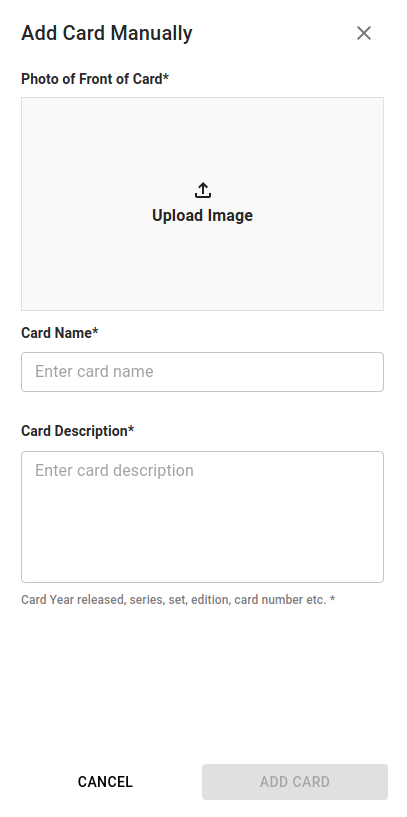 While placing new submission on our website, if you did not find your desired card, you can always upload manual card details by submitting name, description and image.
